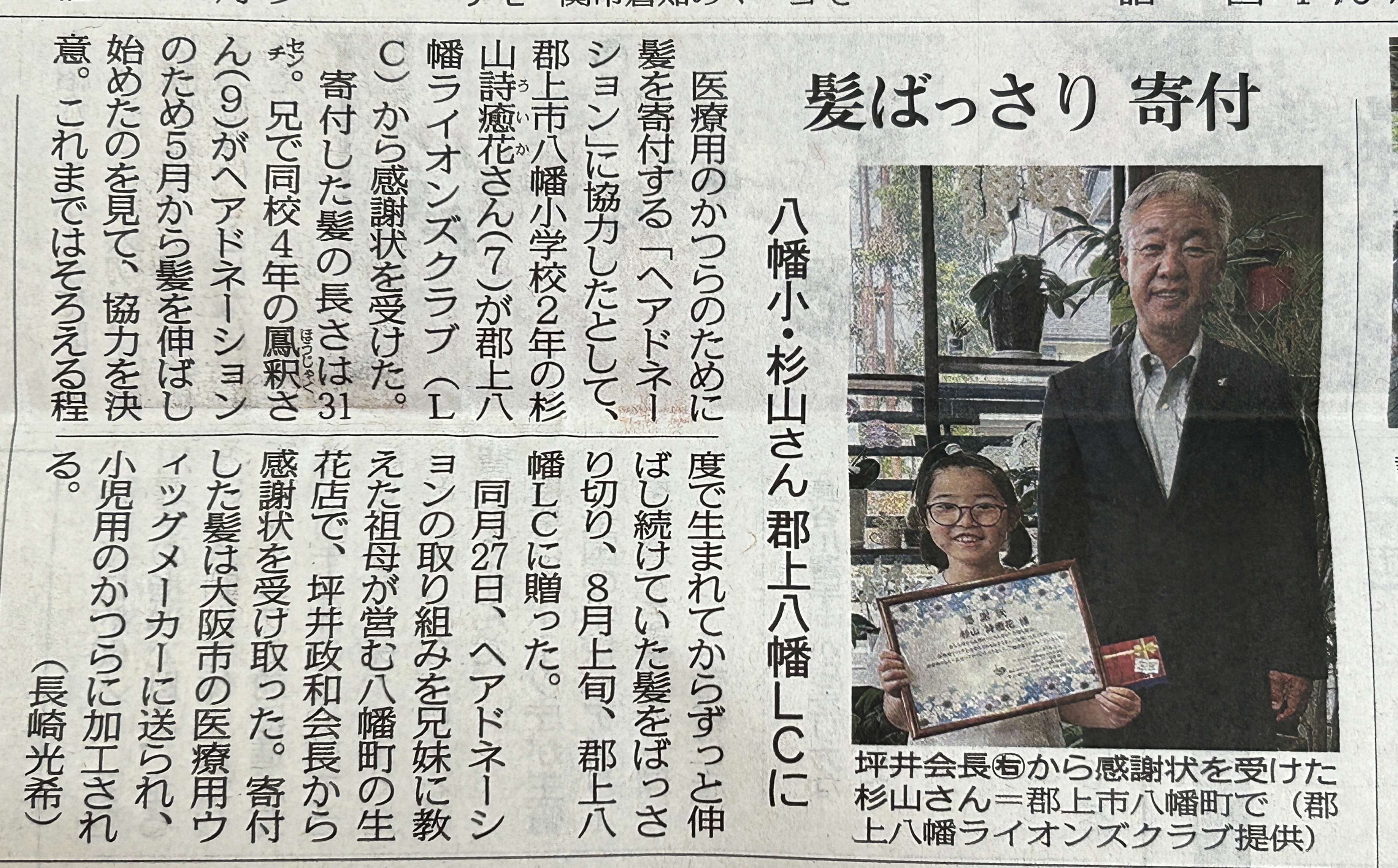 ヘアドネーション新聞掲載 9/4付中日新聞にL加藤美奈恵のお孫さん 杉山詩癒花さんの記事が掲載されました -