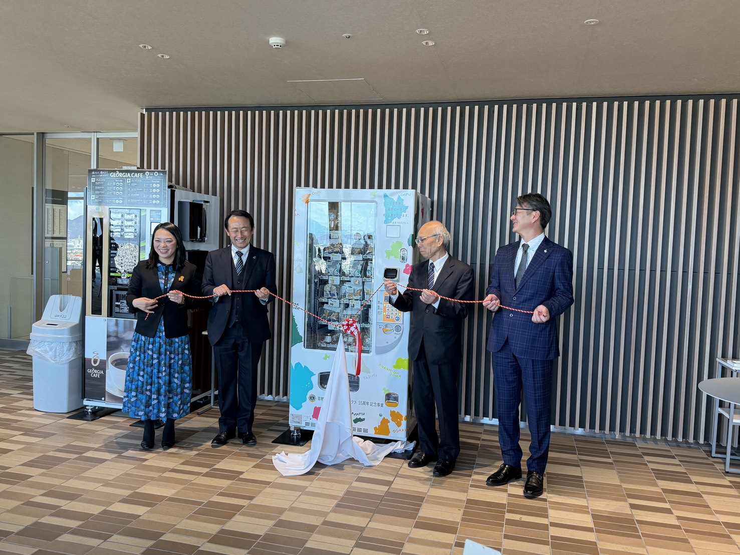 - 1月30日(金)55周年記念事業として県庁20階展望ロビーに自動販売機を設置して寄贈除幕式を行った。「岐阜らしい土産を購入したい」という声に応えて「ぎふのかたちクッキー」や「五平餅」等岐阜ならではの商品を販売し、社会課題解決を目指して働きにくさを抱える人の就労体験を提供し商品補充を担当する。