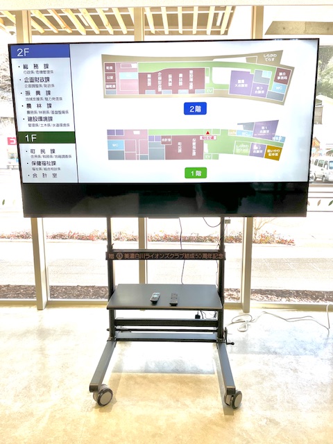 - 来年度、美濃白川ライオンズクラブは50周年を迎えます。その記念事業のひとつとして、白川町新庁舎へワイド液晶ディスプレイを寄贈させていただきました。デジタルサイネージとして、新庁舎へ訪れた方々の為にご活用していただければ幸いです。